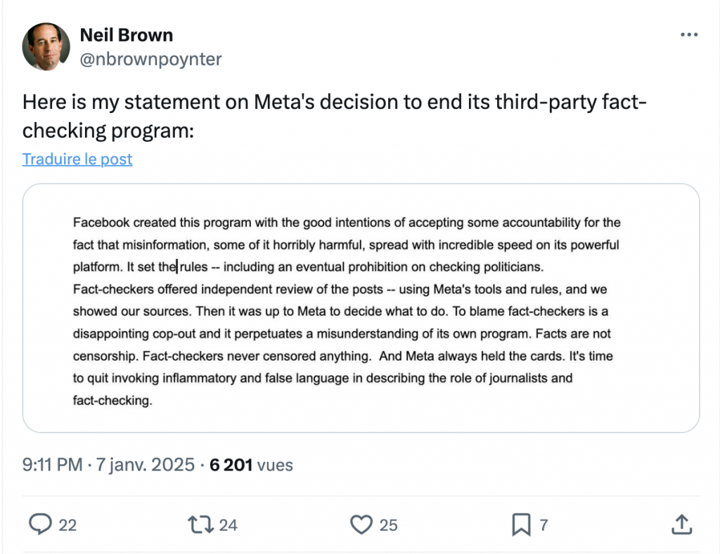 La première annonce était celle de la fin du programme de fact-checking qui était assuré depuis 2016 sur les plateformes Facebook, Instagram et WhatsApp. Ce programme, qui impliquait plus de 100 organisations indépendantes certifiées par l'International Fact-Checking Network (IFCN) et couvrant plus de 60 langues, sera remplacé par un système de notes de communauté semblable à celui utilisé sur X. Pour justifier cette décision, Mark Zuckerberg a indiqué que le « programme destiné à informer est trop souvent devenu un outil de censure. » De son côté, Neil Brown, le président du Poynter Institute for Media Studies qui gère l'IFCN, a déclaré dans un message posté sur X : « Les vérificateurs de faits ont proposé une analyse indépendante des publications – en utilisant les outils et les règles de Meta, et nous avons montré nos sources. Ensuite, il appartenait à Meta de décider quoi faire. Blâmer les vérificateurs de faits est une échappatoire décevante et perpétue une mauvaise compréhension de son propre programme. Les faits ne sont pas de la censure. Les vérificateurs de faits n'ont jamais censuré quoi que ce soit. Et Meta a toujours eu le contrôle. »