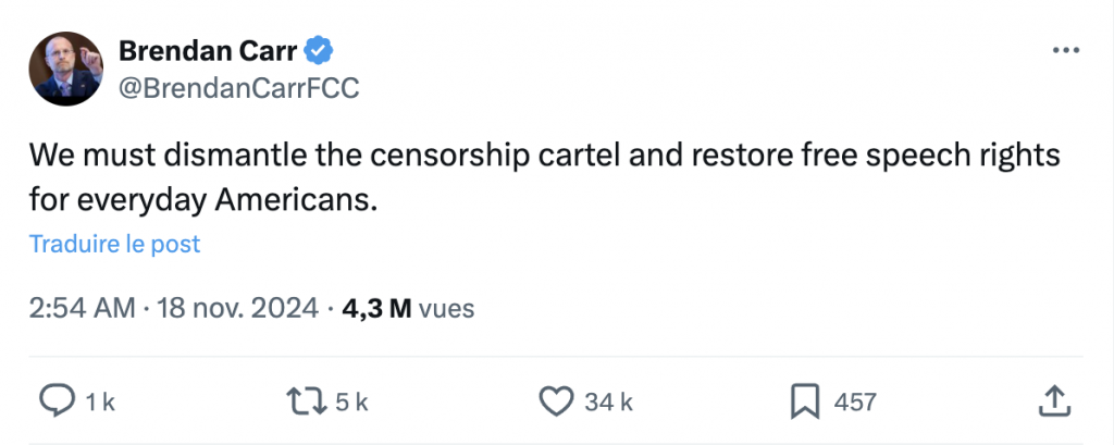 Ces nouvelles mesures, qui ne devraient pas s’appliquer en Europe à cause d’une législation différente et plus stricte, ont été saluées par Brendan Carr, le nouveau directeur du régulateur américain des télécoms, la FCC. Ce dernier est aussi l’auteur du chapitre Telecom du projet 2025, un document de près de 900 pages élaboré par le cercle de réflexion conservateur Heritage Foundation, qui sert de feuille de route pour la refonte de l'État fédéral sous Donald Trump. Il avait profité de sa nomination pour évoquer le « démantèlement du cartel de la censure », comprenez ici, les géants du numérique et leur modération trop encombrante.