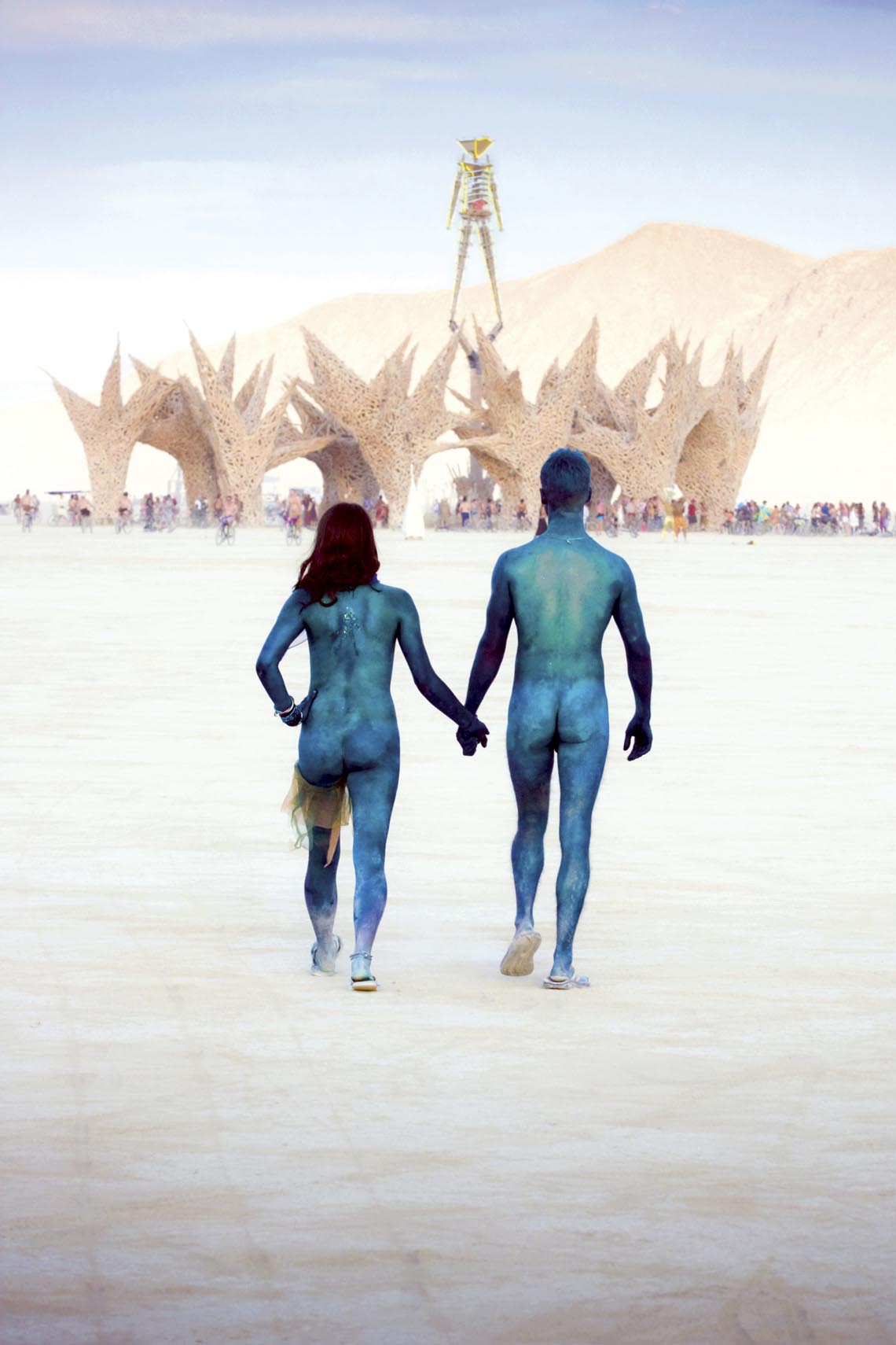 © Scott London :  deux amoureux marchant main dans la main vers « l’Homme » à Burning Man en 2009.
