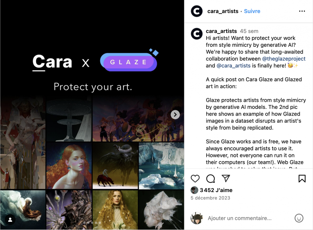 Du point de vue du design et des usages, Cara n'innove pas vraiment et reprend en partie les codes d'Instagram et de X. En revanche, la plateforme intègre des fonctionnalités utiles pour les artistes, comme la possibilité de créer un portfolio ou d'accéder à une section dédiée aux offres d'emploi, facilitant ainsi les échanges entre artistes et entreprises. Cependant, l'aspect le plus intéressant de Cara réside dans ses efforts pour se protéger des IA. La plateforme permet de tester en grandeur nature Glaze, un outil conçu par l'université de Chicago, qui trompe les algorithmes d'IA en incorporant des données invisibles dans les images. Bien que ces données soient indétectables à l'œil nu, elles rendent l'image inopérable pour les modèles d'apprentissage automatisés. De plus, aucune œuvre générée par IA ne peut être publiée sur la plateforme, car elle sera automatiquement détectée et supprimée par la technologie Hive.