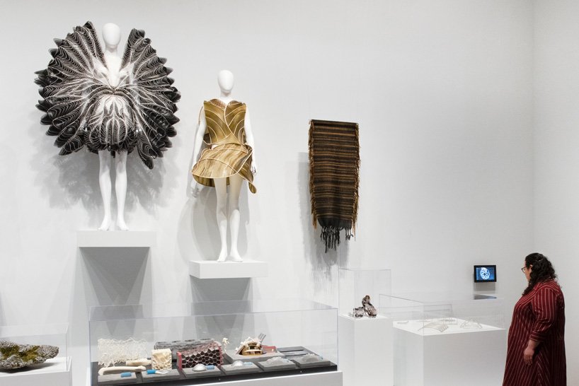 On découvre, dans le cadre de l’exposition, un aperçu des créations chatoyantes d’Iris Van Herpen, à la croisée entre matières organiques et biologie synthétique ou celles de la Française Violaine Buet qui transforme des algues brutes en vêtements dont la texture rappelle celle du cuir.