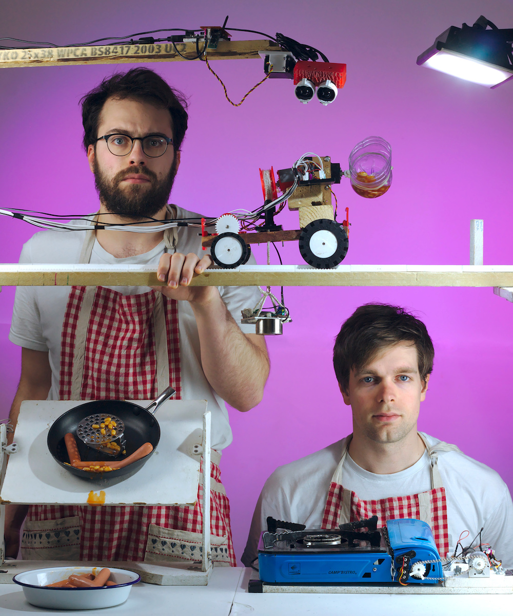 Leurs spectacles reposent entièrement sur la participation du public. Seul prérequis ? Une connexion wifi surpuissante pour que l’audience puisse se connecter aux gadgets présents sur scène depuis un smartphone. « On trouvait ça marrant de tirer le meilleur parti des téléphones et de leur donner du pouvoir sur ce qu’il se passe sur scène », commentent Lloyd et Peter au sujet de « Robot Chef », leur création scénique la plus aboutie. Présentée au KIKK festival fin octobre, elle consiste à concocter un délicieux repas anglais – saucisses et haricots Heinz – via plusieurs étapes inutiles mais franchement hilarantes.