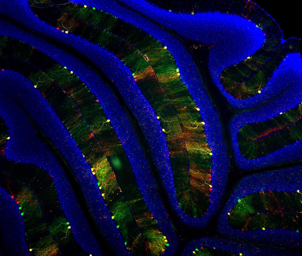 C. V. W. : Je dois déjà avouer que, au départ, ce projet était surtout un moyen pour moi de procrastiner sur ma thèse (rires). Lorsque je l’ai lancé, je me suis rendu compte que j’avais déjà une grande bibliothèque d’images sur certaines cellules et régions du cerveau. J’ai décidé de faire appel à d’autres neuroscientifiques pour avoir une matière plus diversifiée. En général, je leur demande de remplir un questionnaire sur la façon dont ils ont généré ces images, sur ce que les couleurs signifient. Je pense avoir reçu au moins 300 images d’environ 80 scientifiques différents. Israël, Australie, Canada, États-Unis, Allemagne, France, Finlande…, à ce jour, une dizaine de pays ont participé. C’est ludique et très enrichissant de pouvoir interagir avec des chercheurs du monde entier. Cela me donne de nouvelles pistes pour mon propre travail.