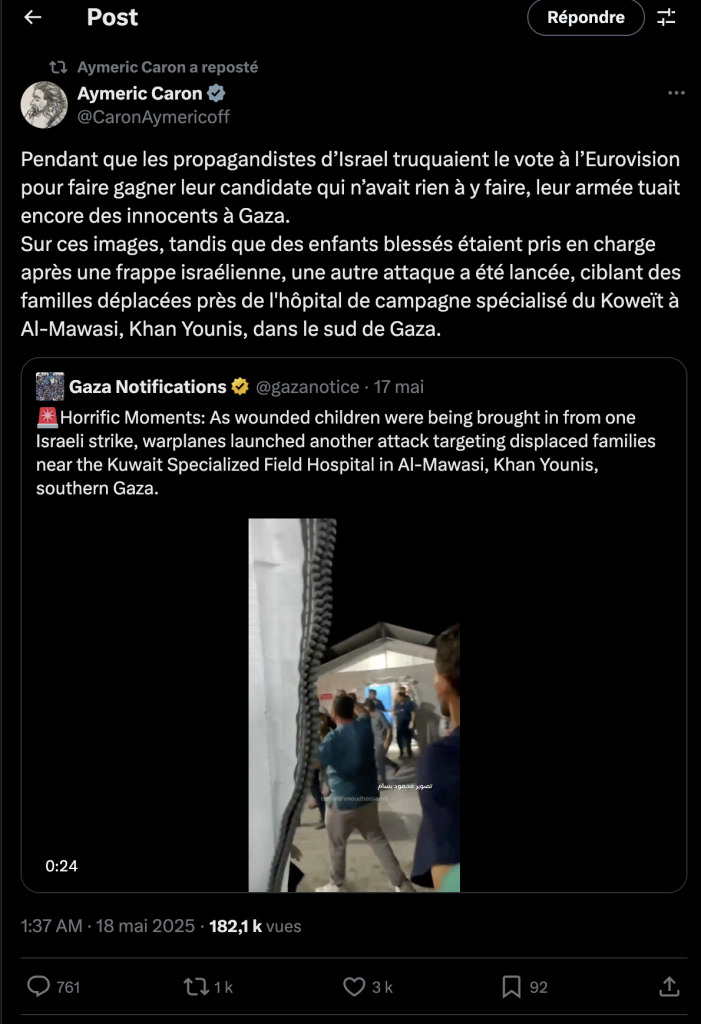 Reprenons depuis le début. Cette année, l’État israélien présentait la chanteuse Yuval Raphael, une rescapée des massacres du 7 octobre, qui interprétait le morceau très symbolique New Day Will Rise (à traduire par : un nouveau jour se lèvera). Ce choix de casting a suscité de vives réactions, alors que les critiques contre la campagne de bombardements intensifs sur Gaza se multiplient, et que le Premier ministre israélien a récemment exprimé son intention de reprendre le contrôle total du territoire. De nombreux internautes y ont vu un message politique, pourtant interdit par le règlement de l’Eurovision.