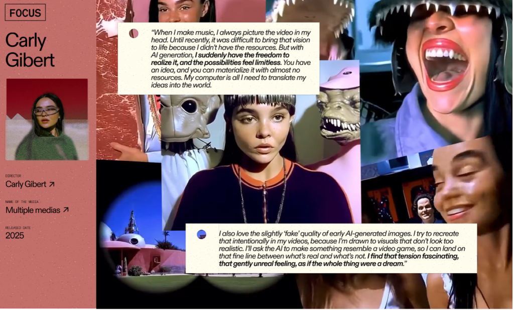 Pour obtenir cette esthétique mi-organique, mi-numérique, la technique du 3D Scan permet de scanner des environnements réels (des maisons, des rues, des couloirs ou des escaliers…) puis de les retravailler pour faire naître des architectures impossibles qui donnent une sensation d’étrangeté. Pour reprendre les mots de Carly Gibert, artiste devenue réalisatrice grâce aux outils IA, cela donne des mondes « doucement irréels, comme des rêves. » Clémentine Duxin, Responsable de la Communication chez Flim et autrice du rapport, le constate : « Souvent, des erreurs sont laissées volontairement. Elles participent à la création d’un monde de rêves semi-éveillés ».