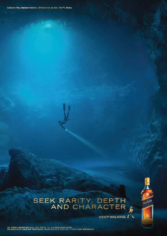 Pour incarner l’esprit Johnnie Walker Blue Label, la marque a fait appel au champion du monde français d'apnée, Guillaume Néry : il a été photographié à quelque 30 mètres sous la mer dans The Pit, le point d'entrée du plus grand système de rivières souterraines au monde, situé dans la péninsule du Yucatán au Mexique.