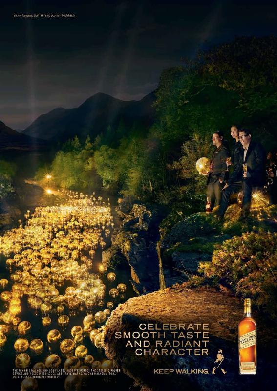 Johnnie Walker Gold Label Reserve puise ses sources dans l’eau des Kildonan Hills où l'on découvrit de l'or en 1863. L’élixir est incarné dans cette nouvelle campagne par les artistes éclairagistes de Bionic League. Ils ont inventé une représentation physique de cette douceur et de cet éclat en produisant une " Rivière d'or " à proprement parler, grâce à des boules disco dorées descendant une rivière des Highlands écossais.