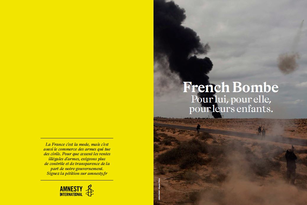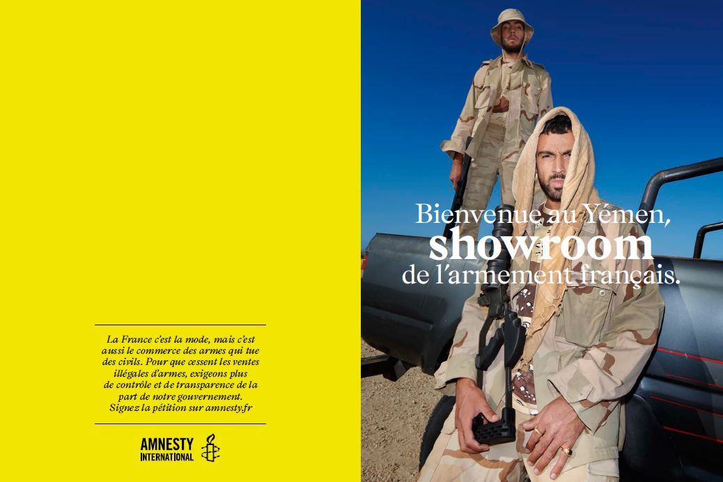 Dans un communiqué, Amnesty International France et son agence DDB Paris annoncent le lancement d'une nouvelle campagne radicale. Lancée pendant la Fashion Week, en affichage et dans plusieurs magazines, elle dénonce les agissements des dirigeants français en faisant le parallèle entre l’industrie de la mode et le commerce des armes.