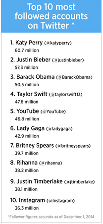 Classement général des personnalités sur Twitter (largement dominé par des artistes internationaux):