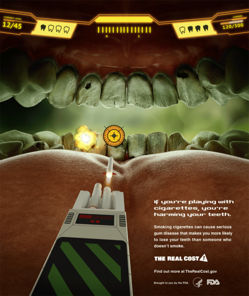 Le FDA vient de lancer une campagne de prévention pour couper l'envie de fumer aux adolescents. Sur trois des spots TV, deux sont particulièrement insoutenables. L'idée pour cette administration, est de démontrer le coût de la cigarette et ses conséquences. Ainsi, puisque fumer abîme la peau, une jeune fille qui s'apprête à régler ses cigarettes et qui n'a pas la somme nécessaire, doit s'arracher la peau du visage pour payer son paquet. Même scénario pour le jeune homme qui, lui, s'arrache une dent abimée par le tabac pour payer son paquet.