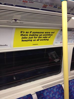 Tous les coups de gueule sont permis, tant qu’ils n’atteignent pas la liberté d’autrui. On l’a tous compris d’une manière très brutale ces derniers jours. Outre-Manche, des activistes ont exprimé leur mécontentement quant à la tournure actuelle de leur société. Et c’est le jour de la rentrée des classes et du retour des travailleurs au bureau qu’ils ont décidé de placarder dans le métro londonien une campagne d’affichage aux propos provocants et accusateurs et dont le hashtag résumait la revendication : #bullshitjobs. Une affiche pointait l’inégalité des professions et des individus entre eux : How can one even begin to speak of dignity in labour when one secretly feels that one’s job should not exist ? ("Comment pourrait-on parler de dignité au travail quand on pense secrètement que certains emplois ne devraient même pas exister ? ") tandis qu’une seconde endossait le role de maxime : The moral and spiritual damage that comes from the situation is profound. It is a scar on our collective soul. Virtually no one talks about it. ("Les dégats moraux et psychologiques engendrés par cette situation ne sont pas négligeables. C'est une cicatrice de notre âme collective. Et pourtant personne n'évoque la situation sur internet."). La dernière quant à elle posait une interrogation bien cynique agissant comme une coup de fouet sur la conscience : It’s as if someone were out there making up pointless jobs for the sake of keeping us all working ("C'est comme si quelqu'un s'amusait à inventer des boulots inutiles dans le simple but de continuer à nous faire travailler.")