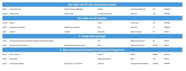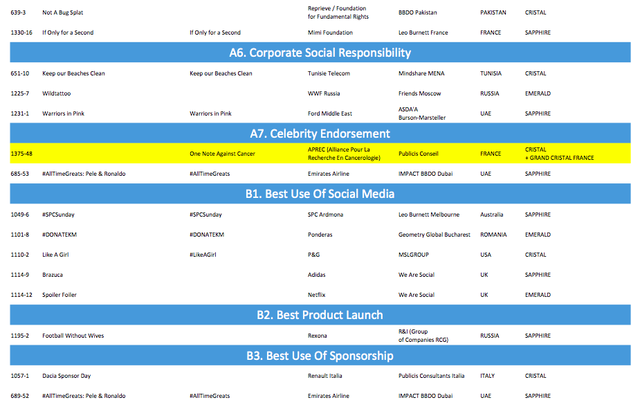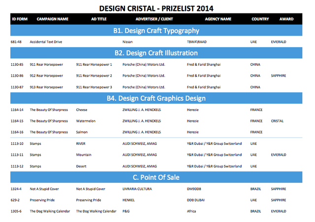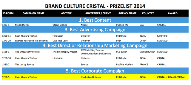 Cristal Festival : prizelists brand culture, design, RP, et sports marketing