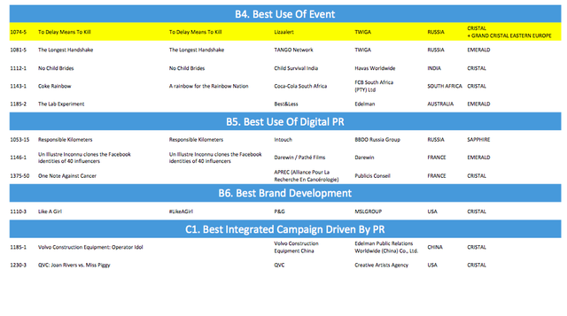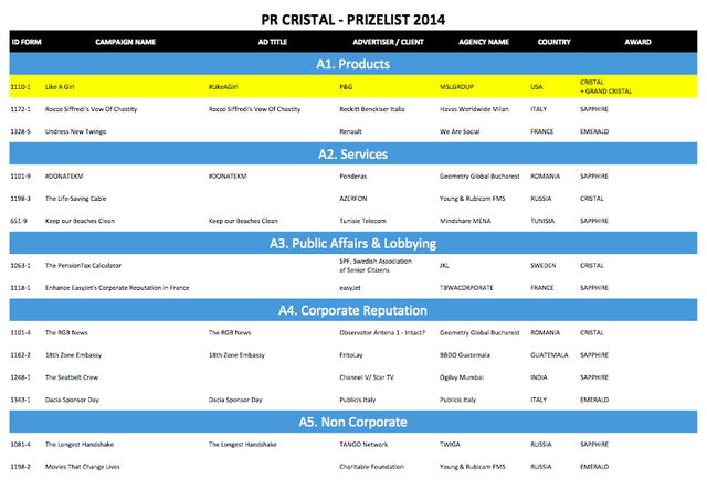 Dans la catégorie RP, Like A Girl, la campagne réalisée par MSLGROUP pour P&G remporte le Grand Cristal pour les RP Produits, One Note Against Cancer pour l'APREC par Publicis Conseil le remporte pour les RP Celebrity Endorsement, tandis que To Delivery Means To Kill, par TWIGA pour Lizaalert le remporte pour les RP Best Use of Event.