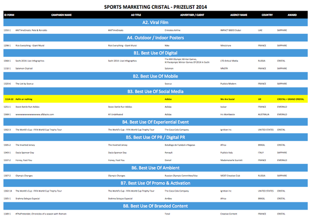 Un seul Grand Cristal dans la catégorie SPORTS MARKETING, remporté par Adidas et We Are Social pour #allin or nothing.