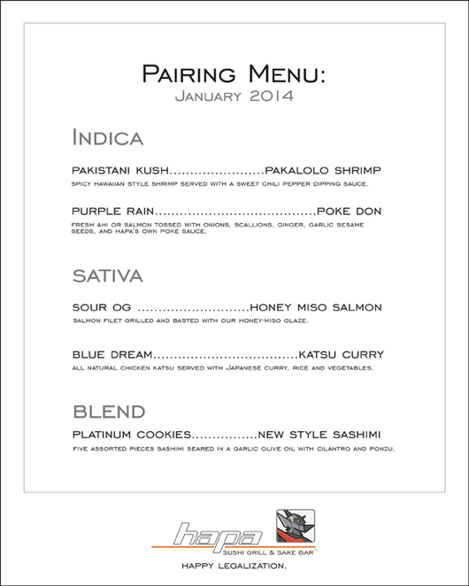 En pure gastronome, la chaîne de restaurant Happa Sushi à Boulder s’est en effet posé la question : quelles herbes pourraient le mieux accompagner ses poissons ? Et c’est après une étude minutieuse que le restaurant a revisité sa carte en mettant la grande variété d’herbe de cannabis en avant. Le menu est désormais classé en trois catégories de saveurs ou de variétés de chanvre : Indica, Sativa, Blend.