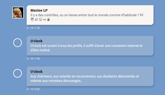 Au fil de leur conversation, l’internaute découvre la véritable mission d’O'clock : aider les Français à se former au développement web. Il ne s’agit pas d’un MOOC, mais d’une formation intensive en temps réel. Chaque jour, les étudiants se connectent et participent à l'atelier de la journée, encadrés par des formateurs expérimentés. « En 4 mois, vous pourrez obtenir les compétences et l'expérience pour trouver un emploi de développeur. O'clock est ouvert à tous les profils, il suffit d'avoir une connexion Internet et d'être motivé. », précise le site.