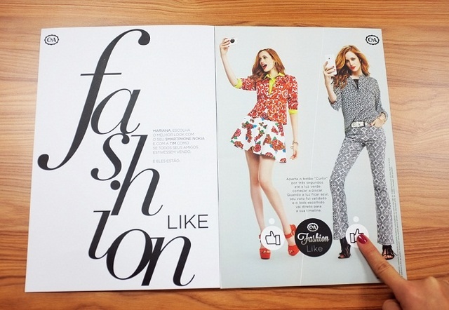 Pour autant, l’agence, en 2014, change son fusil d’épaule pour C&A. Désormais les looks s'affichent et se partagent sur Facebook! A tous les followers de la marque au Brésil, DM9DDB a fait parvenir un exemplaire du magazine Contigo. A l’intérieur était insérée une page publicitaire arborant deux looks proposés par la marque, à côté desquels étaient accolés deux boutons interactifs ‘like’. Les lecteurs ont pu ainsi afficher leur préférence sur Facebook et partager cet avis avec leurs amis. En sus, les ‘likes’ comptabilisés étaient affichés en temps réel dans un magasin C&A à São Paulo.