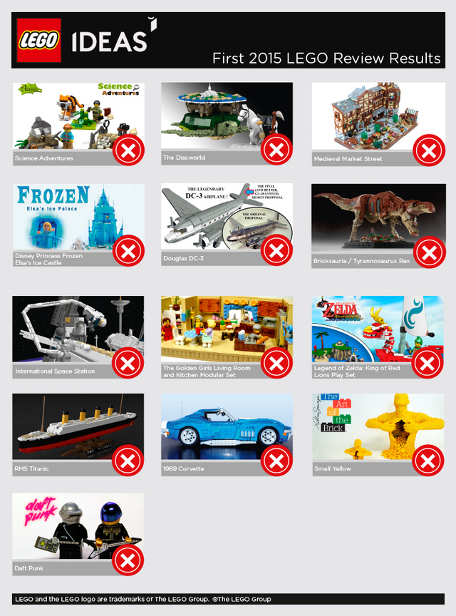 Les fans avaient pourtant fait preuve de créativité : réplique du Titanic, du château de la Reine des Neiges, d’une corvette 1969, des populaires Daft Punk… Difficultés d’obtenir les droits d’exploitation, manque d’intérêt des firmes possédant les droits, soumissions trop proches de produits LEGO déjà sur le marché…. Certains de ces facteurs ont dû jouer sur leur décision… en attendant aucun gagnant : -(