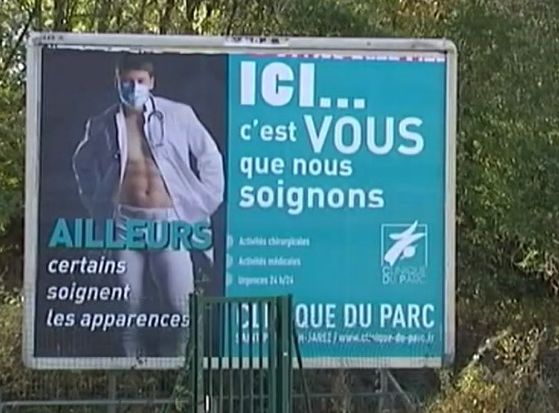 Ce sont deux visuels diffusés par la clinique privée du parc de Saint-Priest-en-Jartelle Jarez dans la Loire, qui ont créé la polémique : l’un dévoilant une jeune femme à la tenue d’infirmière très courte, l’autre arborant un jeune homme en tenue blanche, stéthoscope au cou et dont la chemise ouverte laisse entrevoir une musculature digne des mannequins d'Abercrombie & Fitch. Outre le sexisme évident, stigmatisant l’image des infirmier(e)s, c’est surtout la signature fustigeant clairement les centres médicaux de la région qui pose problème : « Ailleurs, certains soignent les apparences. Ici…c’est vous que nous soignons. »