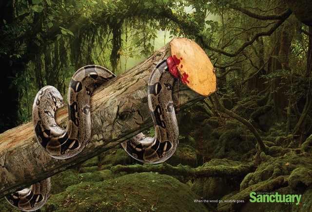 La déforestation des forêts vierges est aujourd’hui responsable de la disparition de nombreuses espèces : un animal sauvage ne peut survivre sans son habitat naturel, la vie du premier est intimement liée à celle de l’autre. Une simple faille dans l’écosystème entraîne des conséquences irrémédiables pour la faune et la flore. Un message d’urgence que le magazine Sanctuary Asia a décidé de relayer à travers une série de visuels très forts signés « When the wood go, wildlife goes ».