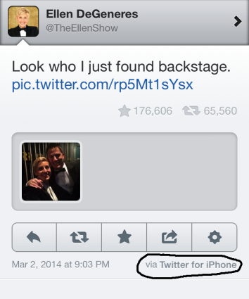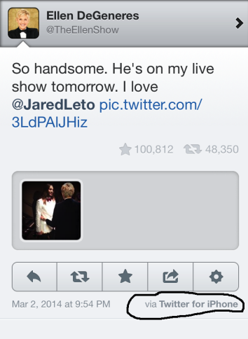 Dommage toutefois que la célèbre animatrice du talk-show à son nom sur NBC, une fois retournée en coulisse, ait immédiatement réutilisé ce qui semble être son IPhone personnel. Elle n’a pas hésité à se prendre en photo avec Jared Leto et Channing Tatum, mais cette fois-ci les images allaient être estampillées ‘Twitter pour IPhone’… le meilleur ennemi de Samsung.