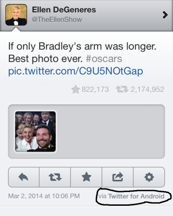 Dimanche soir avait lieu la 86ème cérémonie des Oscars au Théâtre de Los Angeles. Partenaire depuis cinq ans de l’évènement, Samsung a eu la bonne idée cette année, en plus des cinq minutes de pub diffusées pendant la cérémonie, d’équiper Ellen DeGeneres du Galaxy Note 3. Une bonne idée puisque cette dernière, en parfaite maîtresse de cérémonie, s’est fendue d’un Selfie, entourée de Bradley Cooper, Jennifer Lawrence, Kevin Spacey, Brad Pitt, Angelina Jolie, entre autres stars… Stratégie marketing ou total impro ? Toujours est-il que Samsung se fait un gros coup de pub avec ce Selfie posté directement depuis le compte Twitter d’Ellen DeGeneres et retweeté plus de 2 millions de fois en seulement quelques heures. Cette photo ainsi que celles qui allaient suivre étaient estampillées ‘posté depuis Twitter pour Android’.
