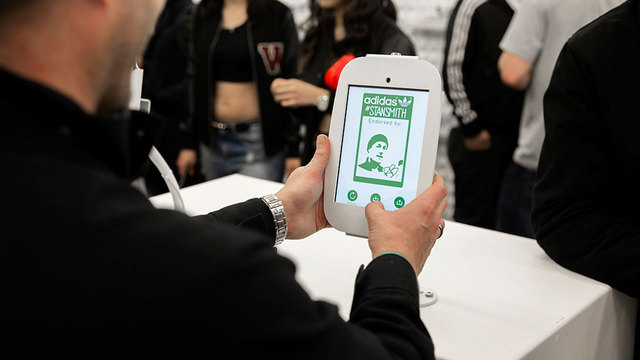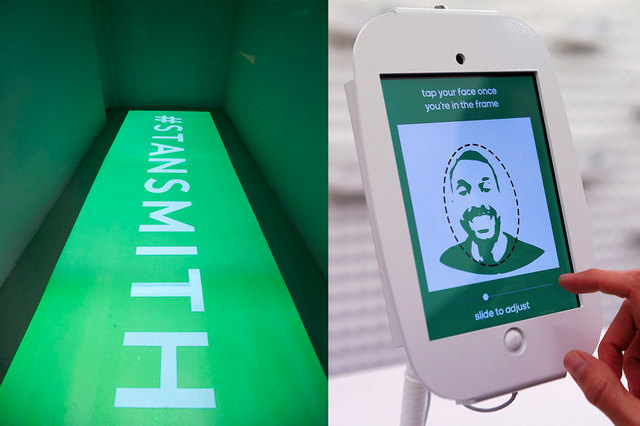 Cette boîte à chaussure géante (7,5/ 13,5 mètres) a été érigée à Old Truman Brewery, à Londres, mi-janvier. Elle proposait aux londoniens de venir y acheter des éditions limitées du modèle Stan Smith et de participer à des expériences interactives : 120 paires de Stan Smith avait été disposées au mur, disponibles à l’achat, et trois installations permettaient aux visiteurs de se connecter de manière plus intime à la marque. Ainsi, un sol interactif, disposé à l’entrée, leur permettait de contrôler la diffusion d’images numériques; douze imprimantes 3D réalisaient sous leurs yeux des lacets personnalisés qu’ils pouvaient ramener chez eux par la suite ; enfin, et plus amusant, l’application Stan Yourself, proposait aux visiteurs de capturer leur portrait et de l’insérer au logo Stan Smith.