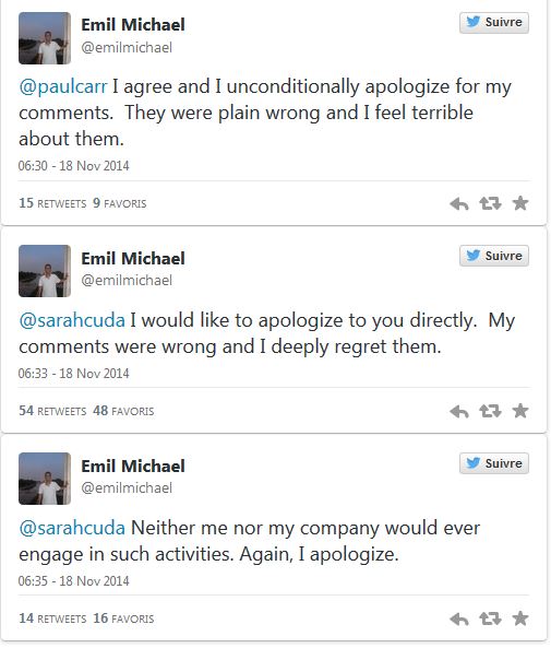 Quand le vice-président d’Uber, Emil Michael, menace une journaliste un peu trop critique... il se repent et se répand sur Twitter pour se faire pardonner.