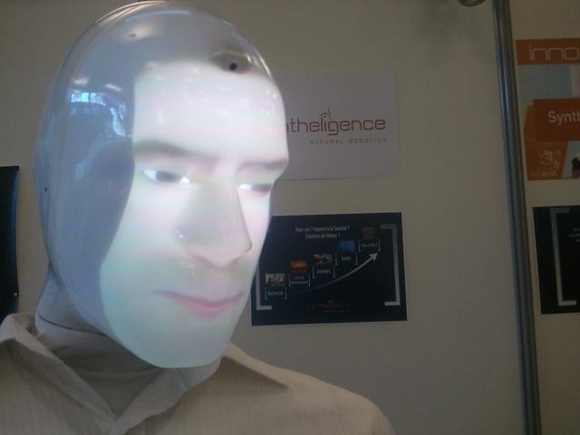 Syntheligence est une jeune start-up, créée en mai 2013, spécialisée dans la robotique sociale : elle est à l’origine de la création de cette tête robotique aujourd’hui diffusée en partenariat avec Mediavea et initialement baptisée Ligthy.