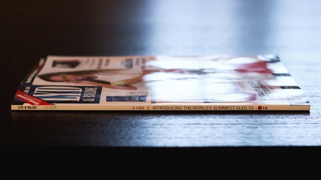 Un argument de taille pour LG qui a voulu le matérialiser en publicité : la marque s’est approprié la tranche du magazine high tech LYD & Bilde (Sound & Vision), tout en précisant que la hauteur du magazine était en mesure équivalente à celle de son modèle, soit 4 millimètres.