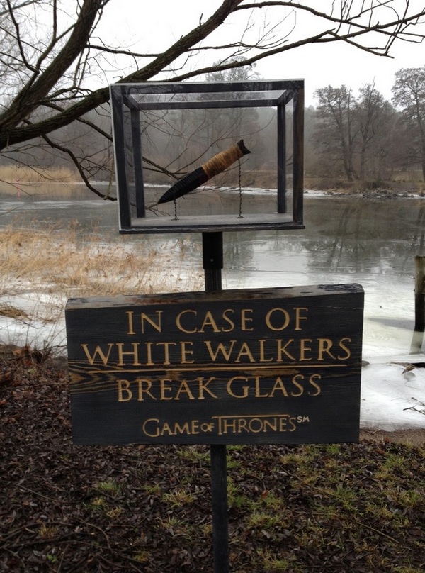 Pour le lancement de la Saison 3 en Suède, Warner Home Entertainment Nordic a enfermé dans des boîtes en verre des Dragonglass, indispensables aux gardiens du Mur pour en finir avec les White Walkers. Atmosphère parfaitement adéquate pour lancer cette opération d'ambient marketing, qui a eu lieu au coeur des nuits hivernales de la capitale. C'est à Stockholm que les fans ont pu s'armer.