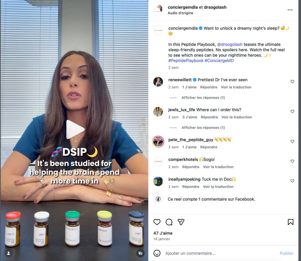Sur Instagram, les cliniques d' « hormone optimization » et de « longevity medicine » pullulent, surtout aux États-Unis. Certaines, comme Concierge MD ou Drip Hydration, proposent des bilans sanguins ultracomplets, des consultations en visio, puis des protocoles personnalisés à base de CJC-1295, Ipamorelin, Sermorelin ou BPC-157 en perfusion, livrés directement chez vous. D’autres, comme Luxury Anti-Aging & Longevity Clinic, jouent la carte du spa médical : fauteuils design, lumière douce, perfusion au bras et promesse de « rebuild » total du corps en quelques mois.