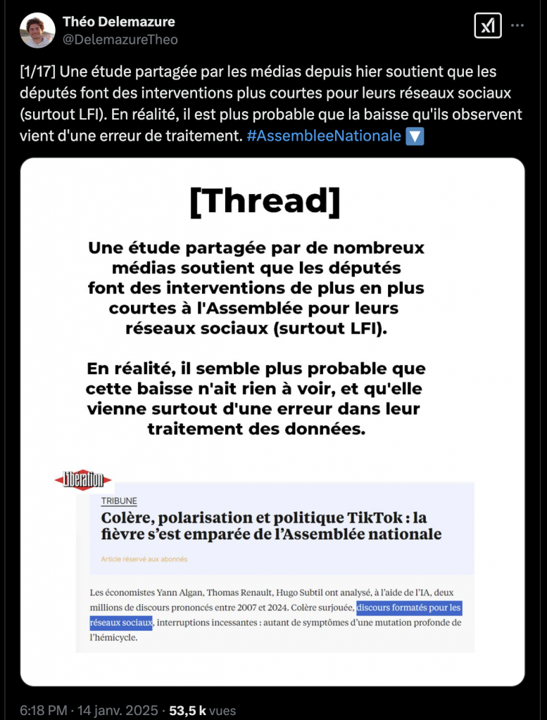 Dans un texte intitulé « Non, les députés ne font pas des interventions plus courtes pour TikTok », Théo Delemazure, doctorant en informatique à Paris Dauphine, livre une analyse critique de la note du CEPREMAP. Selon le créateur du site C'est de gauche ou de droite ? , si l'étude soulève des questions pertinentes sur l’évolution des pratiques parlementaires, certaines de ses conclusions méritent d’être nuancées. En ligne de mire : la méthodologie employée et notamment les données du site NosDéputés.fr utilisées par l’équipe d’Algan qui seraient, selon le chercheur, moins complètes que celles publiées en open data de l’Assemblée nationale depuis 2017. « En utilisant cette source plus précise, mes propres observations remettent en question certains résultats, notamment ceux sur le nombre moyen de mots par intervention et leur évolution dans le temps. »