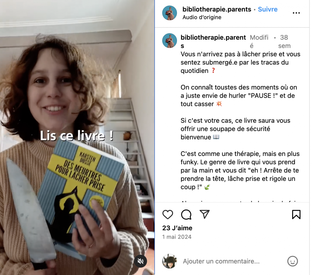 La bibliothérapie se développe sous de multiples formes, et le lien entre lecture et bien-être prend de l’ampleur. Recommandations de livres sur Reddit, TikTok, discussions en bibliothèques, lectures à voix haute en groupe... Sur Instagram, Camille Luciani distille ses conseils littéraires pour les parents en quête de repères. De son côté, Sarah, alias @petits_loustics, partage ses suggestions jeunesse. Les deux créatrices animent aussi des ateliers et formations.