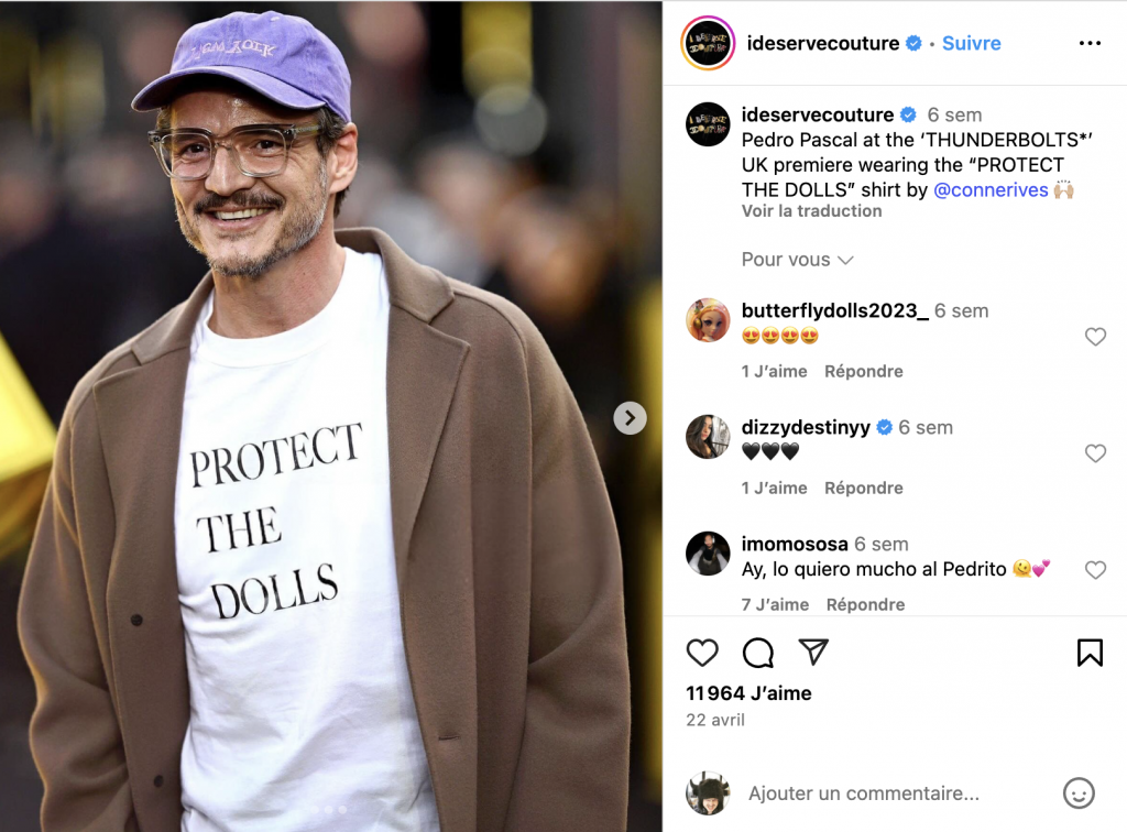 Connu pour son sens aigu du style, Pedro Pascal s'est fait remarquer lors de la promotion londonienne du dernier blockbuster Marvel, « Thunderbolts ». Sur le red carpet londonien, l’acteur – que l’on surnomme désormais l’Internet Daddy – apparaît, portant un T-shirt du créateur londonien Conner Ives, sur lequel est inscrit noir sur blanc : « Protect The Dolls ». Cette expression est devenue en quelques mois un appel à solidarité à destination de la communauté trans (surnommée les « dolls / poupées » dans la scène drag), en réaction aux mesures LGBTqphobes de l’administration Trump et à la décision de la Cour suprême du Royaume-Uni, qui a statué en avril que la définition légale d'une femme repose sur le sexe biologique.