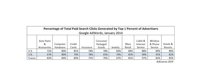 Les résultats sont issus d’une étude brevetée par AdGooroo, le service de renseignements sur les moteurs de recherche de Kantar Media, qui a examiné la publicité payante sur un moteur de recherche à travers 10 catégories différentes sur Google AdWords en France, aux Etats-Unis et en Angleterre. L’Etude montre que 1% des annonceurs a généré une moyenne de 80% de clics estimés payants à travers toutes les categories.