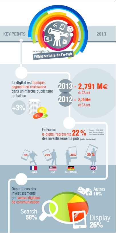 Le marché français de la publicité digitale a atteint 2,791 milliards d’euros de chiffre d’affaires net sur l’ensemble de l’année 2013, progressant ainsi de 3%.