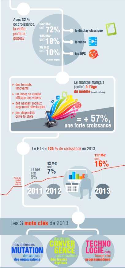 Le « Display », maintient sa croissance en 2013 (+2%) et représente un chiffre d’affaires net de 753 millions d’euros, soit 26% du marché de la publicité online en France. La dynamique de ce segment est observée dans la croissance du display vidéo (+32%), dans la part croissante du display RTB dans les dépenses publicitaires digitales qui atteint cette année 16% et le déploiement du display sur mobile et tablettes qui représente aujourd’hui 10 % du display, pour un montant total de 79 millions d’euros investis