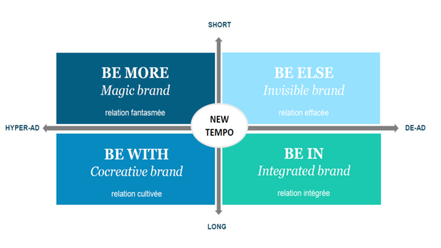 Il s'agit de repenser les signes et les temporalités de la marque autour de 4 dimensions : une présence de marque dépublicitarisée ou hyperpublicitarisée et une relation au consommateur sur un temps raccourci ou un temps allongé.