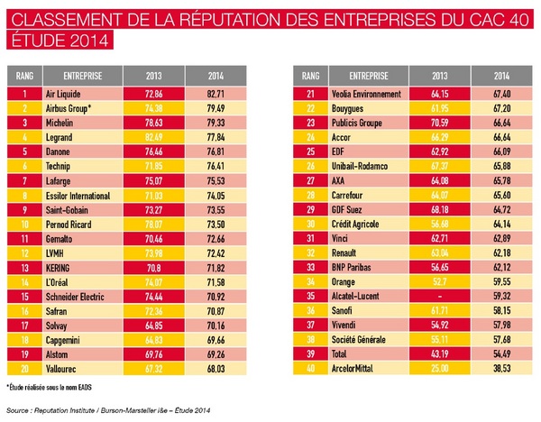 Air Liquide, Airbus Group, Michelin sont les entreprises du CAC40 en tête du classement du baromètre 2014 sur la réputation.