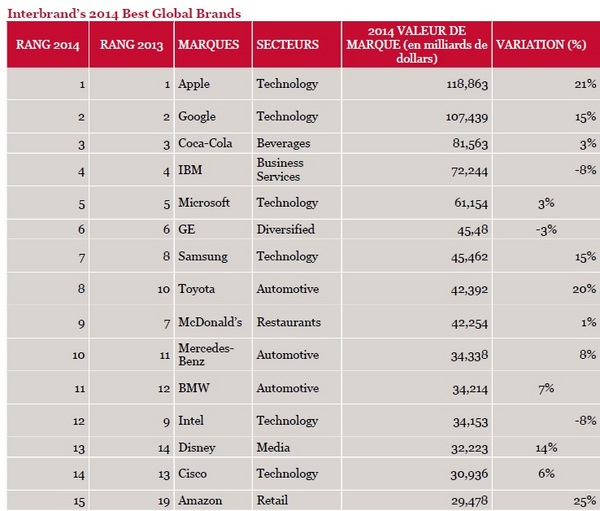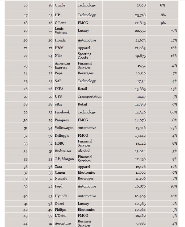 13% des marques du classement viennent du secteur technologique. Les marques ont connu une augmentation de valeur combinée de 11,3% par rapport à l’année dernière, et valent au total 493,2 milliards de $. Alors que Facebook (n°29, +86%), Apple (n°1, +21%), et Google (n°2, +15%) sont les marques qui ont connu la croissance la plus rapide, d’autres acteurs expérimentent une chute de leur valeur de marque. Nokia (n°98, -44%) a connu le plus grand déclin de valeur, passant de la 57ème position en 2013 à la 98ème cette année.