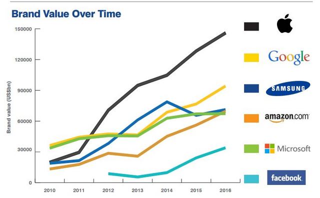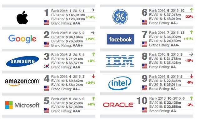 Malgré les prédictions néfastes, Apple reste en tête du classement avec une hausse de valeur de 14%, grâce au succès rencontré par les iPhone 6 et 6s. Valorisée à 145 milliards de dollars, elle creuse l'écart avec Google, qui arrive en seconde position, avec 52 milliards de dollars.Samsung, Amazon.com, et Microsoft viennent compléter le top 5.