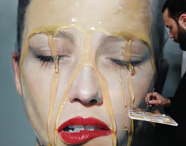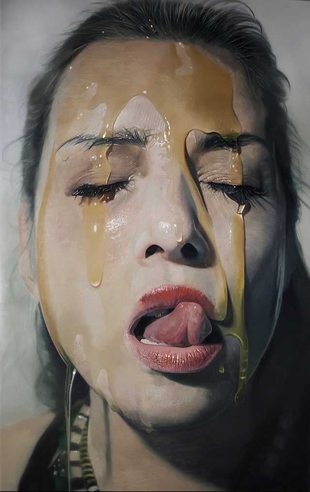 En 2014, le Studio AurumLight dévoilait un calendrier très sexy : à la manière des starlettes des années 50, des mannequins ont posé devant l’objectif avec pour seul vêtement un voile de lait. Une autre manière d’appréhender le liquide et ce, sous toutes ses formes. Aujourd’hui, Mike Dargas nous livre une étonnante série de portraits dégoulinants de miels ou de chocolat et d’une incroyable sensualité. Le travail de cet artiste né en 1983, à Cologne, en Allemagne, n’est pas sans rappeler celui de Blake Little à travers sa série Preservation : des photos de corps comme figés par le miel et qui semblent des sculptures d’anonymes forgées dans de l’ambre. Mike Dargas, lui, donne vie à ses visages et repoussent les limites du réalisme avec ces réalisations à l’huile sur toile. On retrouve une part artistique de ceux qui l’ont inspiré : Dali, Caravage et HR Giger.