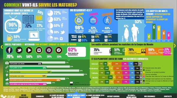 Ils étaient 52% à déclarer vouloir intéragir durant les matchs en postant une photo, un lien (53%), ou commenter à 54%. Durant les matchs, ils sont 75% à utiliser leur mobile, 51% leur tablette, 74% leur ordinateur portable.