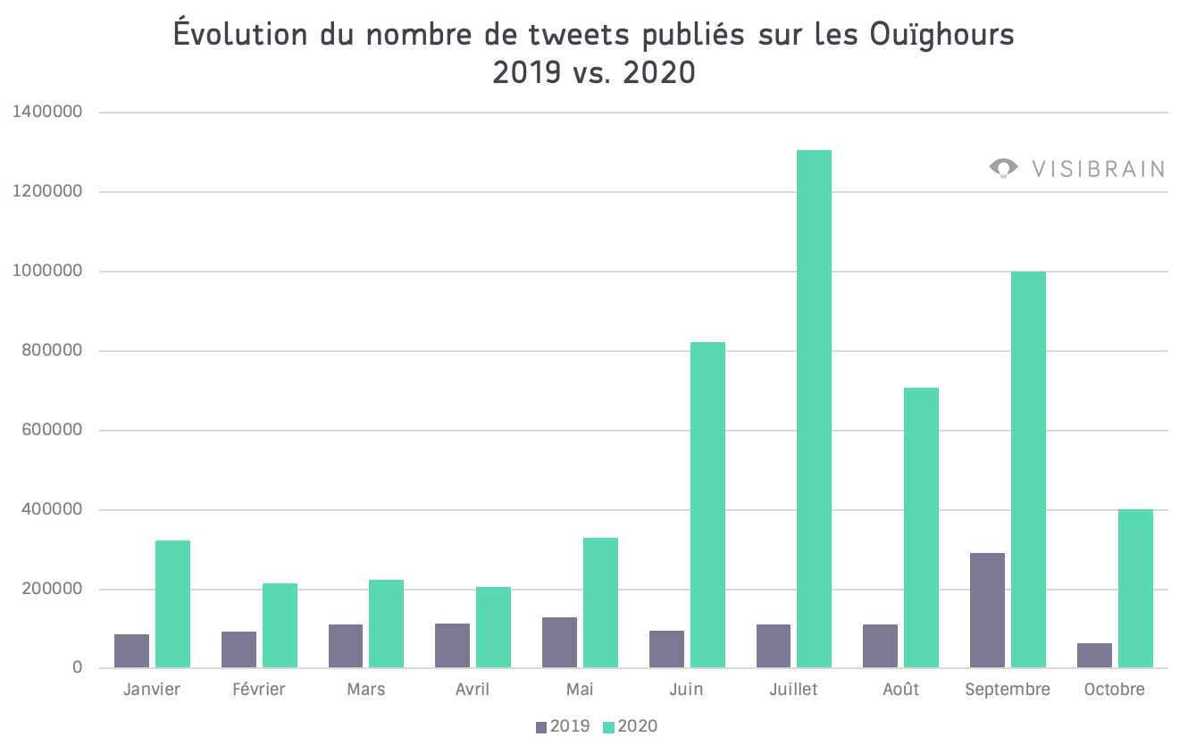 Depuis le 1er janvier 2020, 5 510 985 messages ont été publiés au sujet des Ouïghours, soit 5 fois plus de tweets que l'année passée sur la même période de temps.