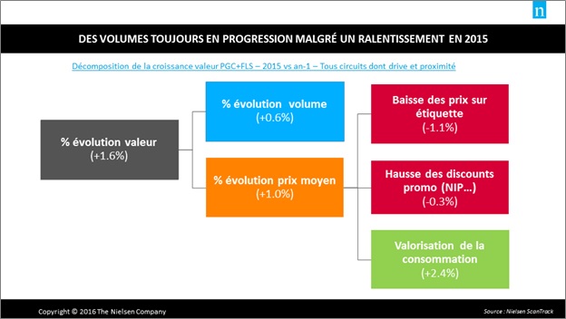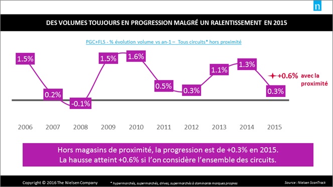 En ce début 2016, Nielsen s’est penché sur les grandes tendances des produits de grande consommation (PGC) en 2015 : l’année se termine avec une progression des volumes de +0.6% et une hausse du chiffre d’affaires de +1.6% en grandes, moyennes et petites surfaces.