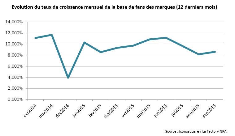 Dans le détail des mois, on observe un tassement du recrutement de fans sur les trois derniers mois de l’étude. Août et septembre 2015 comptent parmi les mois les moins performants avec +8,14% et +8,59% de fans en plus pour les comptes de marques. C’est loin des niveaux relevés en mai et juin 2015 où l’on avait relevé une accélération du recrutement (+11% en moyenne).