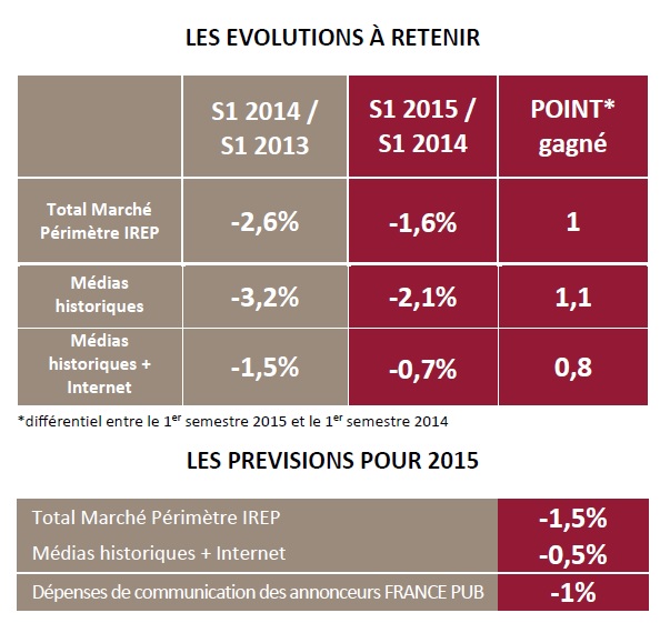 Compte tenu de l’évolution des recettes publicitaires des médias : -2,6% au 1er semestre 2014, -2,5% sur l’ensemble de l’année 2014 et -1,6% au 1er semestre 2015, et compte tenu de l’évolution des recettes publicitaires des médias historiques : -3,2% au 1er semestre 2014, -3,2% sur l’ensemble de l’année 2014, -2,2% au 1er trimestre 2015 et -2,1% au 1er semestre 2015, l’IREP affine son pronostic pour l’année 2015 :