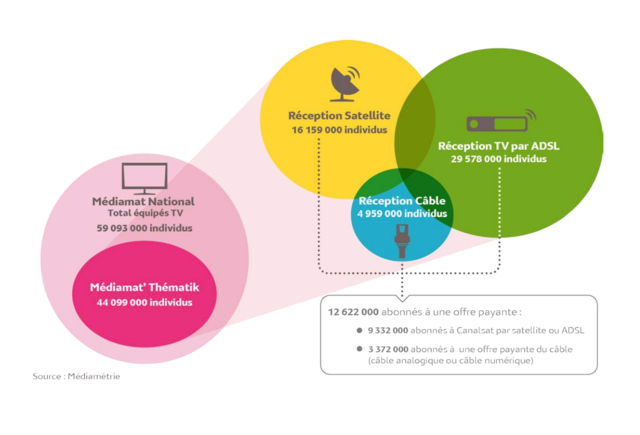 Médiamat’Thématik est la mesure audimétrique de l’audience de la télévision auprès des personnes recevant une offre de chaînes via le câble, le satellite ou la télévision par ADSL, soit 75% de la population équipée TV résidant en France.