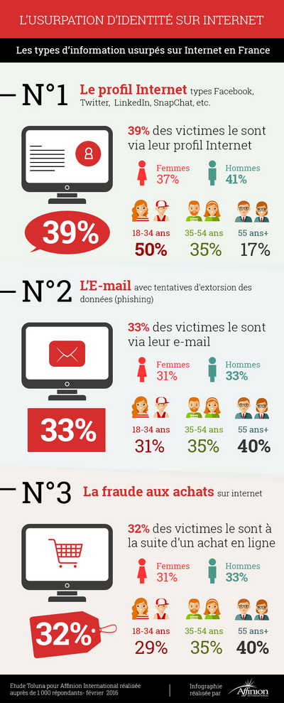 En France, 39% des victimes d’usurpation d’identité le sont via leur profil Internet (Facebook, Twitter, LinkedIn, SnapChat, etc…) et les 18-34 ans sont en première ligne puisque une victime sur deux est dans cette tranche d’âge. Suivent ensuite les 35-54 ans (35%) et les séniors de 55 ans et plus (17%).